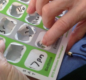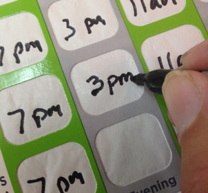Using a black marker I write in large letters the times on each blister when that medication should be taken during the day. The card sits on her coffee table all day and is a constant reminder of when to take her medications especially when no one else is at home.
