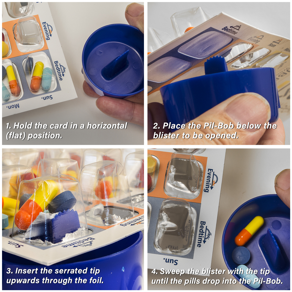 - DO YOU HAVE SHAKY HANDS? – The Pil-Bob Avoids the Spilling or Dropping of Pills while Opening Medication Blister Cards