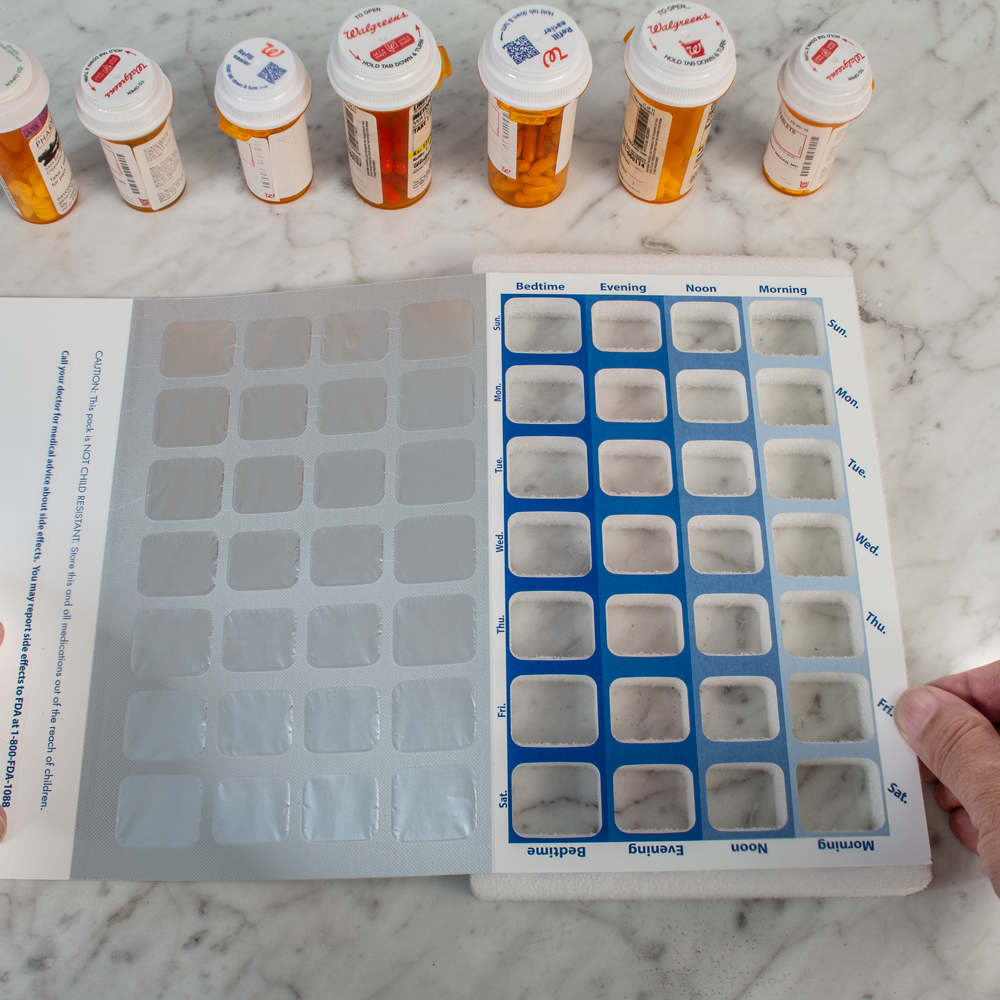 - PHARMACIES CAN EASILY ATTACH PRESCRIPTION LABELS, ADD DISPENSING INSTRUCTIONS, NOTES AND MEDICAL INFORMATION ON THE INSIDE COVER OF THE CARD – The trifold booklet style cold seal medication blister card has plenty of room to write out instructions, emergency numbers, etc. Use the inside front cover flap to write out all the information you may need.