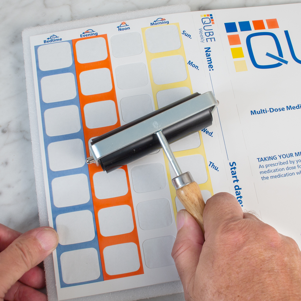 Our sealed, disposable Qube 7-Day, 4-Pass (4-doses per day) Multi-Med Large Card Starter Kit is for those who want their medication adherence program to be as simple as possible. This US pharmacy grade blister card can be filled, sealed and labeled easily at home or in the pharmacy. This pill organizer is a two-part (separate card and blister) card that easy to assemble and use. Each day of this 7-day card is broken into morning, noon, evening and bedtime. Approx. 6 medications can be inserted into each blister. Your pill dispenser starter kit comes with a 6-month supply of cards and blisters, roller and filling template to help you quickly fill your large Qube card. Best yet you’ll be able to fill multiple cards at one time, which will last you of your loved ones for two weeks or more.