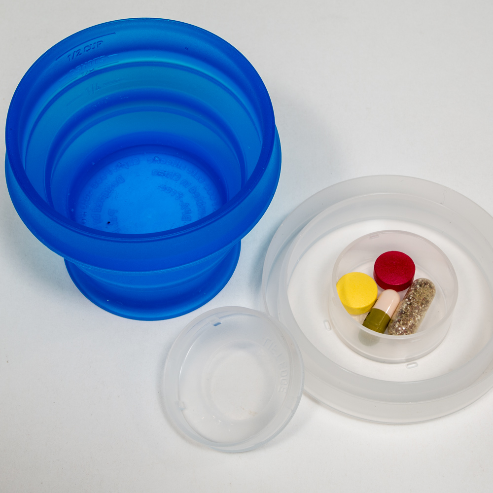 The GoCup is made from FDA food-grade silicone, for a collapsing travel cup that is 100% leakproof. A press-fit lid keeps things clean during transport. The lid provides a compartment for organizing your pills. Bring it on the go or on your next camping or backpacking trip. BPA-free, PC-free, and phthalate-free.