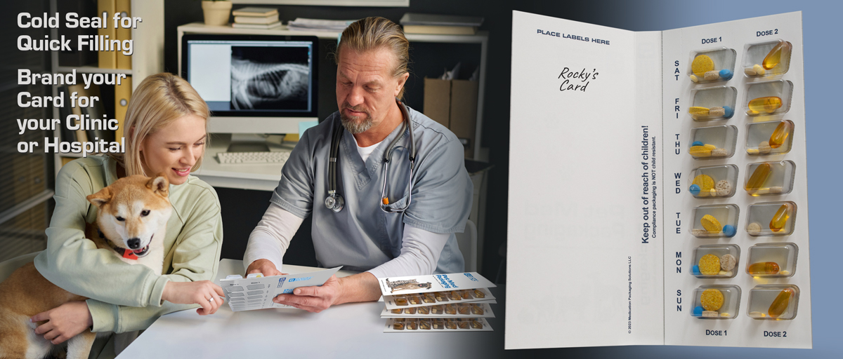 These are the same US made medication blister cards that pharmacies have been using for decades to help their human patients to take the right medication, the right dose at the right time. By offering these blisters cards for your pet patients you’ll be sure that your prescribed medication and supplement regimen will be followed. By presenting your customers with a simple and convenient way to take care of their pet you’ll be able to add an up charge to your customers bill or use this for branding your clinic, (add your logo to the cover of the card) your customer will appreciate your commitment to their pets good health.