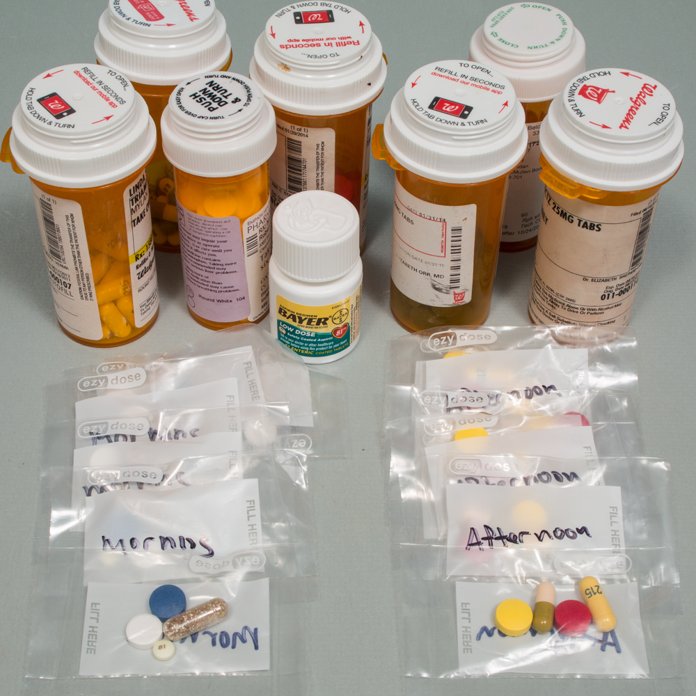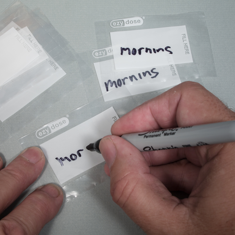 Each sealed pouch can be labeled as morning, noon, afternoon, evening or bedtime.