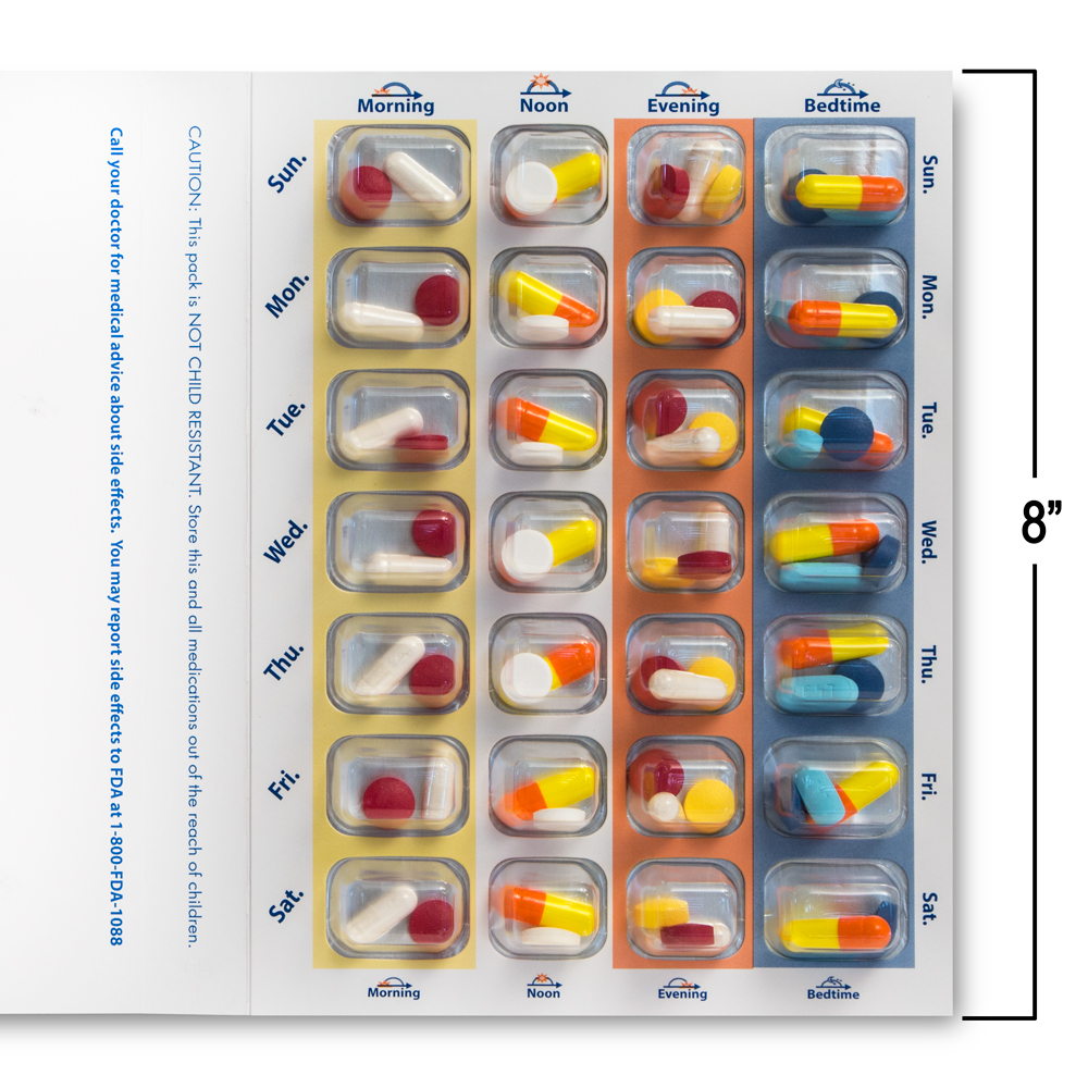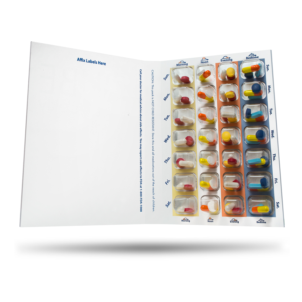 - PHARMACIES CAN EASILY ATTACH PRESCRIPTION LABELS, ADD DISPENSING INSTRUCTIONS, NOTES AND MEDICAL INFORMATION ON THE INSIDE COVER OF THE CARD – The trifold booklet style cold seal medication blister card has plenty of room to write out instructions, emergency numbers, etc. Use the inside front cover flap to write out all the information you may need.