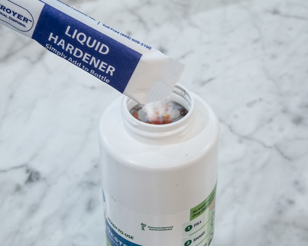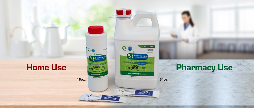 Rx Destroyer™ provides ready-to-use, chemical drug destruction for all purpose and liquid medications including pills, capsules, patches, powders, suppositories, liquids and cannabis waste. Our drug disposal product is pharmacist approved and recommended, Rx Destroyer is found in pharmacies across the United States, Canada and South America. Just drop your old medications into the bottle’s liquid, once full drop in the packet of hardener and toss it into any common trash receptacle. Rx Destroyer chemical drug destruction meets DEA “non-retrievable” standards and meets or exceeds disposal regulations for solid waste in most states.